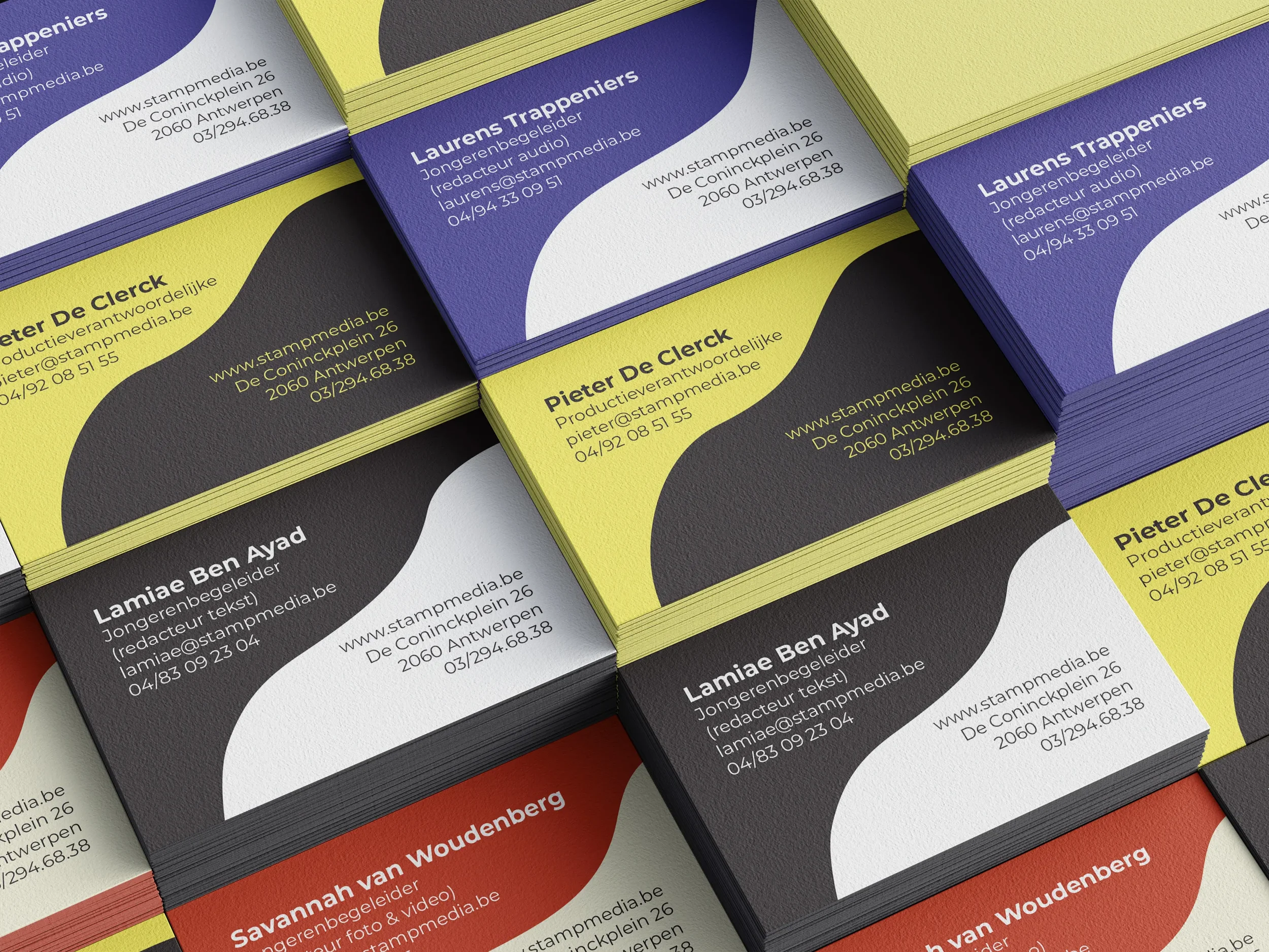 Redesigned business cards for StampMedia employees with a focus on creating a unique and playful identity. Used a division line across the card to split it into two color zones, allowing each employee to have their own distinct colorway. This approach created visual cohesion across the team while giving each card individual personality.